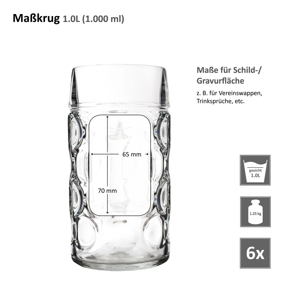 - 6x 1L-Maßkrug (1.000 ml), geeicht, Ø 105 mm, H 200 mm, oben Ø 95 mm, 1.250 g