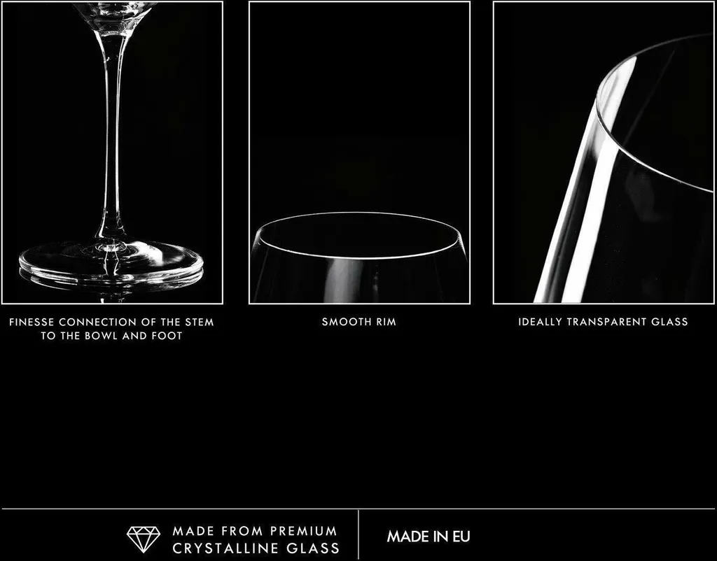 860 ML VOLUMEN – Das perfekt transparente Glas hat eine Höhe von 255 mm und einen Durchmesser von 115 mm. Die schlanke Form und ideale Proportionen machen die Weinprobe noch schöner.