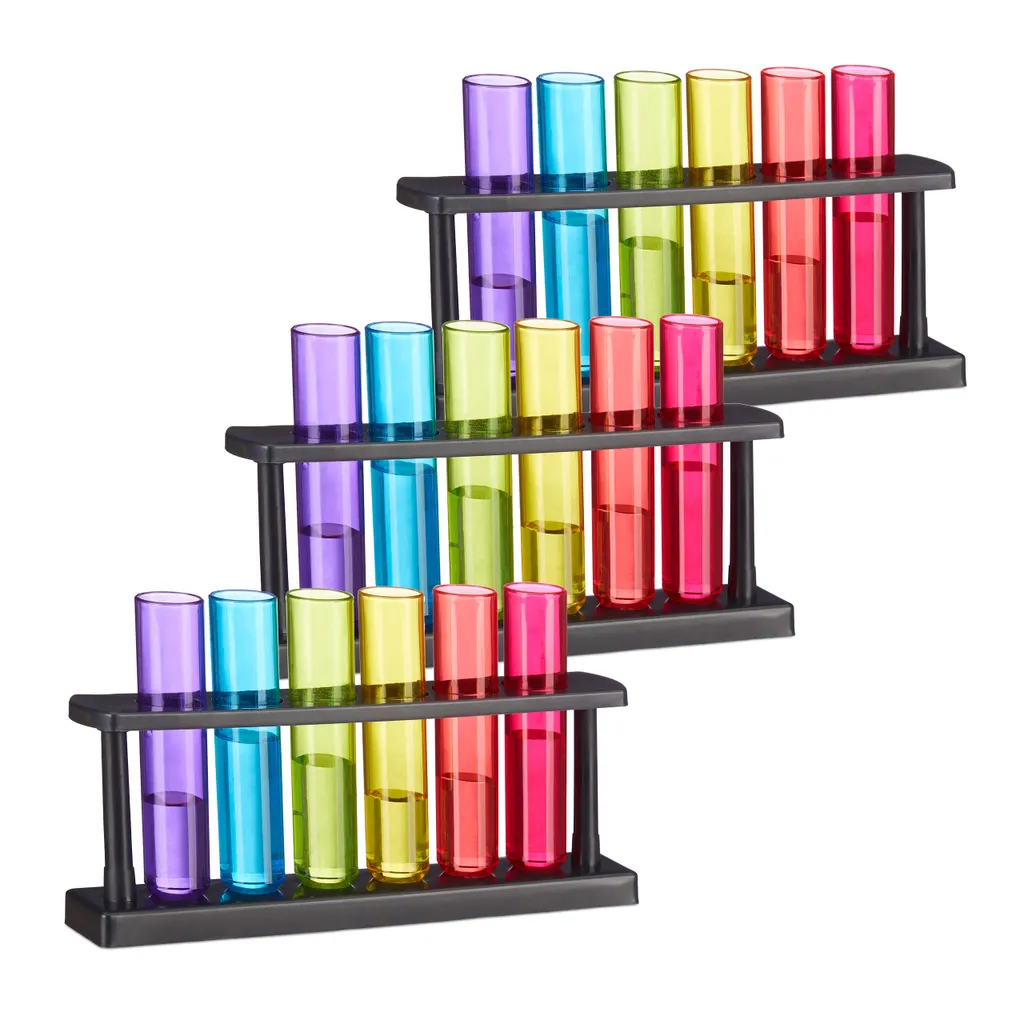 Damit der Partyabend ordentlich eskaliert, darf Alkohol natürlich nicht fehlen. Wo eben noch das verkrampfte Suchen nach Gesprächsthemen vorherrschte, zieht schon nach ein paar Gläsern beste Stimmung ein. Kein Wunder also, dass mittlerweile auch Chemiker an tiefschürfenden Untersuchungen von C2H6O interessiert sind. Kein Problem, denn die 6 Reagenzgläser in verschiedenen Farben machen Lust, die ganze Nacht durchzuforschen! Die lallend vorgetragenen Forschungsergebnisse lassen sich mit den Shotgläsern wunderbar feiern, die trinkkulturelle Errungenschaft des Saufspiels bietet sich dazu an!