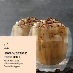 - Doppelwandige Gläser aus mundgeblasenem Borosilikatglas mit Isolierfunktion für heiße und kalte Getränke